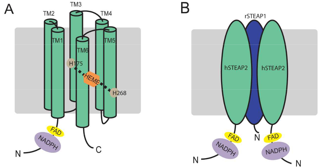 STEAP1、STEAP2均 屬于 STEAP (six-transmembrane epithelial antigen of prostate) 蛋白家族,具有六個跨膜結構域、細胞質N端的多跨膜蛋白。其中STEAP1的編碼基因由 339 個氨基酸組成,位于 7q21.13 染色體上。STEAP1的 N 端胞質結構域與 STEAP 蛋白家族的其他成員不同,不具有類似于 NADP+氧化還原酶(FNO)結構域的特征。因此,STEAP1不能獨立表現出Fe3+和 Cu2+的還原活性。