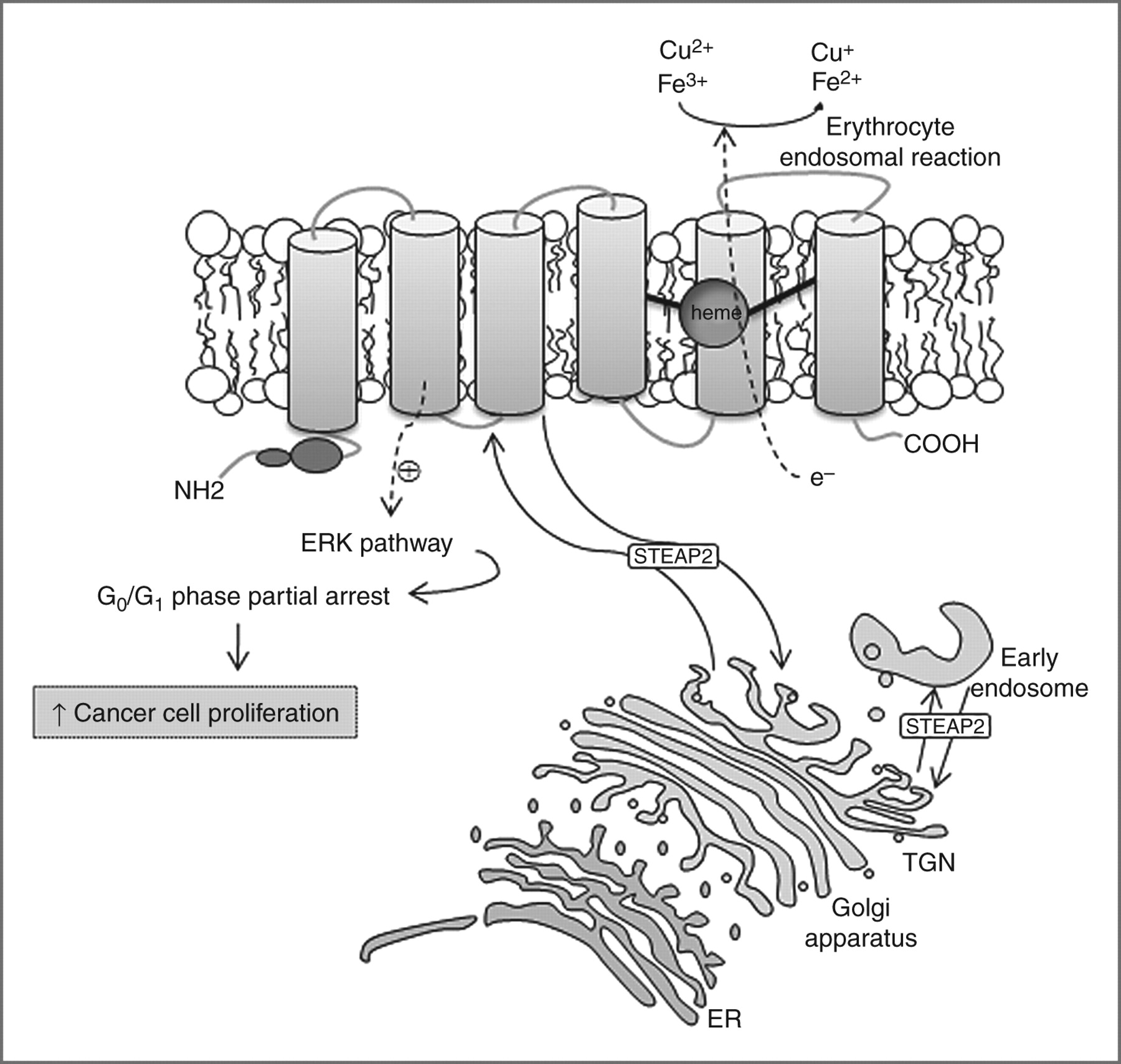 STEAP2,又被稱為前列腺六跨膜蛋白 1(STAMP1),是一種由 490 個氨基酸組成的(56.1 kDa)蛋白質,其在高爾基體復合體、跨高爾基體網絡以及質膜中高度表達。這表明 STEAP2 參與了某些內吞和外排運輸途徑。STEAP2 有助于紅細胞中 Fe3+ 和 Cu2+ 的正常攝取,并將其還原為 Fe2+ 和 Cu+,從而促進轉鐵蛋白循環的進行。通過激活 ERK 通路,STEAP2 誘導癌細胞在 G0-G1 細胞周期階段的部分停滯,從而增加細胞增殖和腫瘤發展。