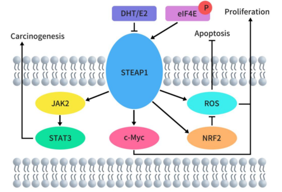 STEAP2 的過度表達會促進前列腺癌細胞的增殖,而其低表達水平則與前列腺癌細胞的增殖減少有關。STEAP2 似乎至少在一定程度上通過上調促進細胞周期進程的因子(例如細胞周期蛋白 H、Ki67)以及下調抑制細胞周期進程的因子(例如細胞周期蛋白依賴性激酶抑制劑 p21)來促進細胞增殖。這一點已被實驗所證實,即轉染了 STEAP2 siRNA 的細胞表現出增殖表型的降低。這些增殖和抗凋亡活性可能與 STEAP2 介導的絲裂原活化蛋白激酶(MAPK)通路活性的上調有關。各種組織重塑蛋白的表達,例如 MMP13、MMP3、SERPINE1 和 MMP7,也會受到 STEAP2 表達變化的影響。此外,在正常的前列腺細胞系 PNT2 中,STEAP2 的過度表達賦予了遷移和侵襲的表型,這表明 STEAP2 過度表達在驅動前列腺癌細胞的轉移潛能方面起著作用。