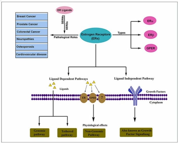 在過(guò)去的幾十年中,ER在前列腺癌、結(jié)腸直腸癌和乳腺癌等各種癌癥中的作用已被深入研究。研究表明,雌激素受體不僅會(huì)介導(dǎo)乳腺癌的發(fā)生,而且在許多其他的人類病理(如心血管疾病、骨質(zhì)疏松癥和肥胖、阿爾茲海默癥、自身免疫性甲狀腺疾病)中發(fā)揮作用。