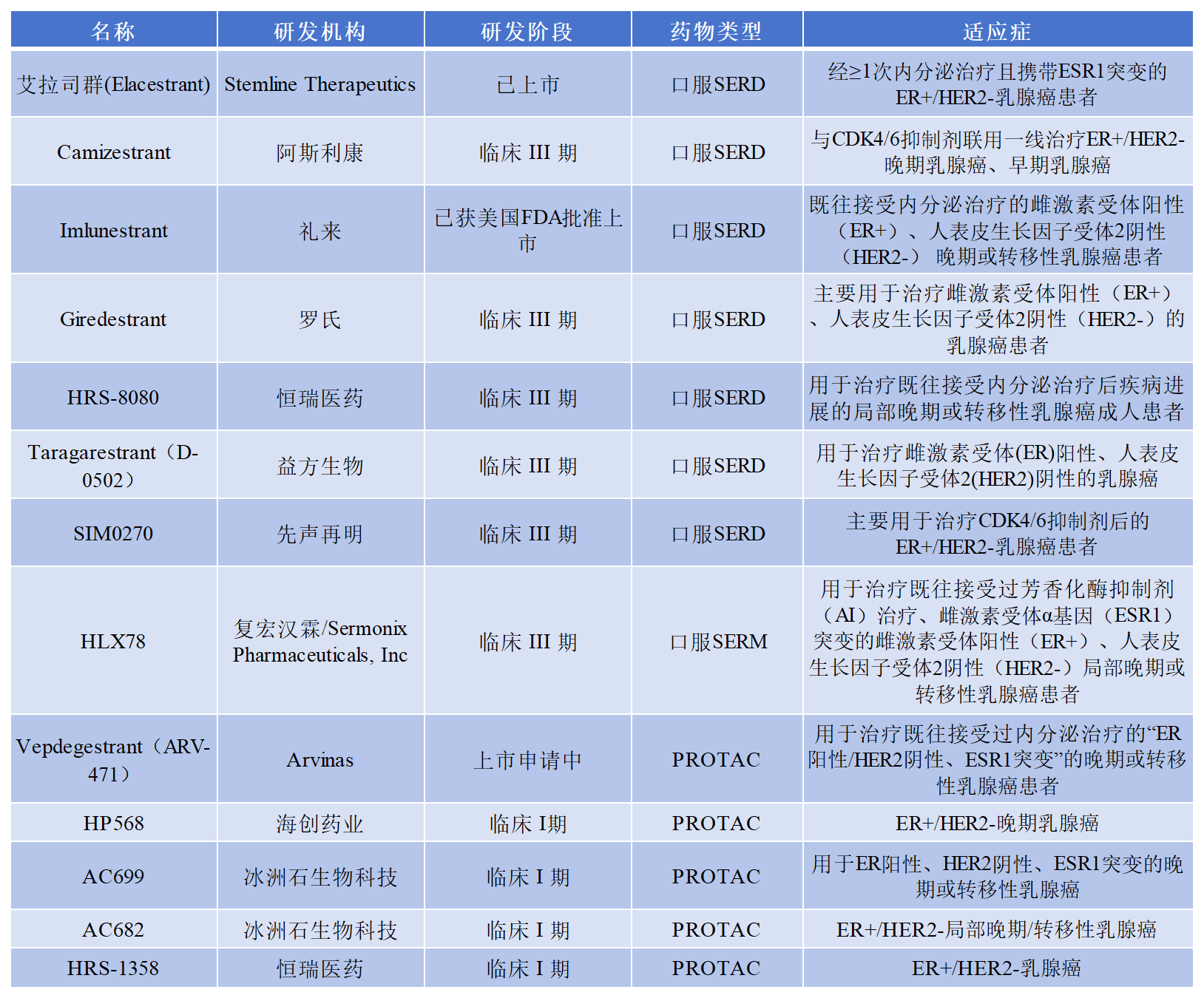 從他莫昔芬、芳香化酶抑制劑到氟維司群,傳統(tǒng)療法逐漸暴露出耐藥性、注射給藥不便等局限性。新一代口服選擇性雌激素受體降解劑(SERD)以創(chuàng)新作用機(jī)制和口服優(yōu)勢(shì),有望重塑HR+/HER2-乳腺癌的治療格局。另外,還有降解 ER的PROTAC等藥物在研發(fā)中。以下為部分已上市或處于臨床階段的藥物信息: