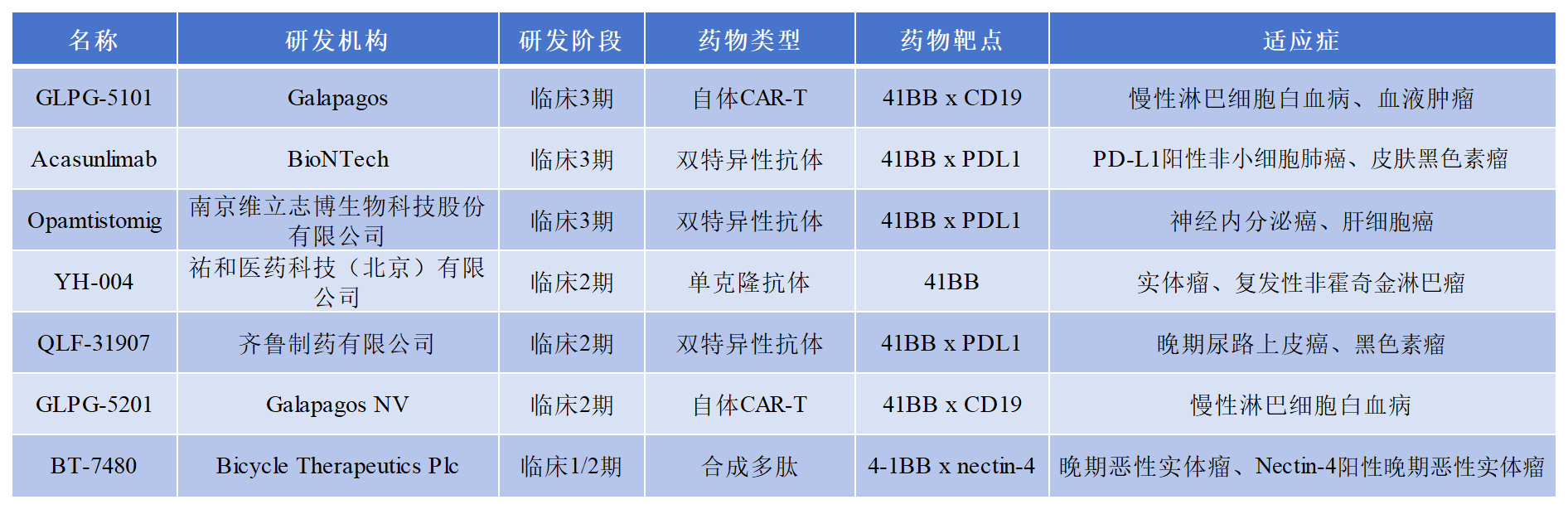 關(guān)于4-1BB在研的部分藥物進展如下表所示: