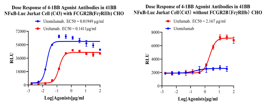為助力4-1BB靶點藥物研發(fā),我們開發(fā)了41BB/CHO、41BB/HEK293、41BB/NFκB-Luc/HEK293、41BB/NFκB-Luc/Jurkat和4-1BBL CHO細胞篩選模型,產(chǎn)品驗證結(jié)果如下: