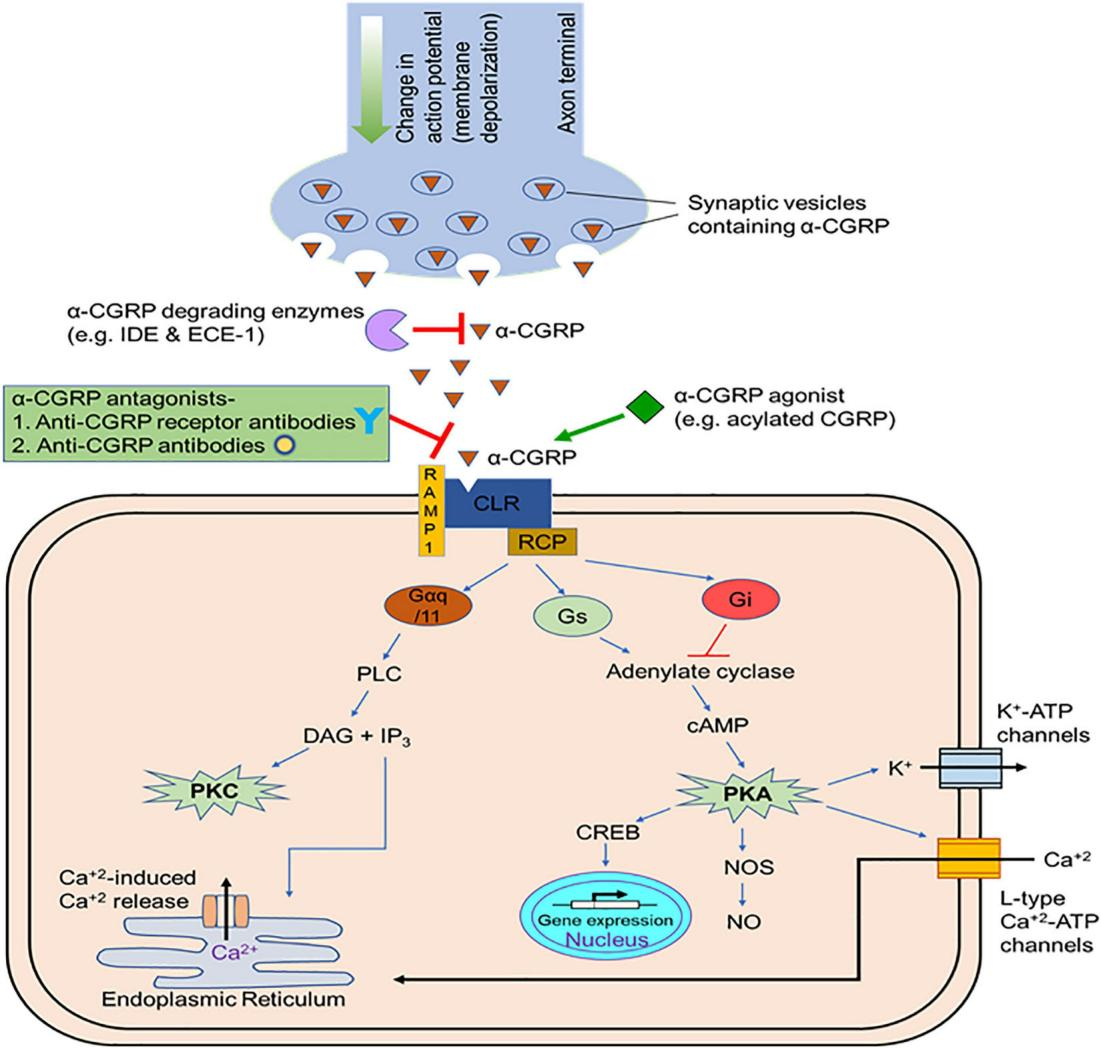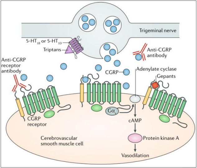 降鈣素基因相關肽(calcitonin gene-related peptid,CGRP)是一個含有37個氨基酸殘基的感覺神經源性多肽,分為α-CGRP和β-CGRP兩個亞型,廣泛分布于中樞神經系統(主要是三叉神經血管系統、丘腦和小腦)。CGRP是一種強效的血管擴張劑,它主要由感覺神經(如三叉神經)釋放。CGRP釋放后與腦血管平滑肌細胞表面的CGRP受體結合,引起腦血管擴張。CGRP受體的結構主要包括:降鈣素受體樣受體(CALCRL)、活性修飾蛋白受體(RAMP)及結構蛋白受體(RCP)。CGRP受體復合物是一種G蛋白偶聯受體,通過激活蛋白激酶A系統,參與疼痛信息的病理調控過程。