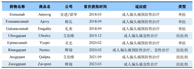 2018年以來,已有多款靶向降鈣素基因相關肽(CGRP)或其受體的藥物獲批,用于偏頭痛的治療或預防,這標志著偏頭痛治療新時代的到來。與傳統療法相比,CGRP相關療法具有顯著的改進,它們特異性地作用于三叉神經疼痛系統,且很少或沒有不良反應。Ubrogepant等CGRP受體拮抗劑可以有效緩解偏頭痛的急性發作,而Eptinezumab、Fremanezumab和Erenumab等靶向CGRP或CALCRL的單克隆抗體可以有效預防偏頭痛發作。目前,全球已批準8款CGRP/CGRPR類偏頭痛藥物上市,國內僅君實生物和博安生物有所布局。其中君實生物的CGRP單抗JS010于2022年12月30日申報臨床。隨著患者需求不斷提高及創新藥物相繼面世的推動下,預計2024年偏頭痛領域市場規模可超110億美元,未來CGRP類藥物市場空間潛力巨大。