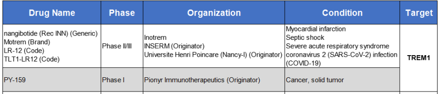 TREM1作為一個(gè)新靶點(diǎn),全球范圍內(nèi)披露的研發(fā)管線(xiàn)不多,針對(duì)TREM1靶點(diǎn)有2款產(chǎn)品進(jìn)入臨床,1款產(chǎn)品即將進(jìn)入臨床(Celsius公司的CEL383,適應(yīng)癥為炎癥性腸?。_m應(yīng)癥主要為急性感染性疾病、自身免疫性疾病和癌癥。目前TREM1靶點(diǎn)針對(duì)癌癥的臨床前藥物比較活躍的是nangibotide(處于臨床II/III期)及PY-159(處于臨床I期)。其中較引人關(guān)注的是Pionyr Immunotherapeutics公司的TREM1抗體PY159正在與帕博利珠單抗聯(lián)合用于晚期實(shí)體瘤患者的Ia/Ib期研究。PY159 是一種人源化單克隆抗體,能特異性地結(jié)合表達(dá)在髓系細(xì)胞上的TREM1,并通過(guò)交聯(lián)TREM1/DAP12 復(fù)合物誘導(dǎo)下游信號(hào)傳導(dǎo),發(fā)揮激動(dòng)劑的作用。2023年 ASCO報(bào)道的 PY159 的用于冷腫瘤相關(guān)瘤種的I期的臨床研究,結(jié)果顯示總體安全性可控,療效方面 ORR 為 6%,DCR 為 33%,其中胰腺癌患者展現(xiàn)出較好的療效??偟膩?lái)說(shuō),TREM1靶點(diǎn)藥物的作用機(jī)理和效果還不是非常明確,正在研發(fā)的藥物療效也不是很出色,未來(lái)前景還值得繼續(xù)觀察。