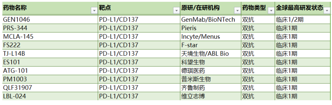 由于4-1BB在高度耗竭的PD-1高表達(dá)CD8+TIL上顯著表達(dá),并且在PD-1阻斷后進(jìn)一步上調(diào),而4-1BB信號傳導(dǎo)則會誘導(dǎo)CD8+TIL的克隆擴(kuò)增,CD8+TIL表現(xiàn)出腫瘤反應(yīng)性而無終末分化,因此4-1BB和PD-L1可能是誘導(dǎo)T細(xì)胞抗腫瘤反應(yīng)機(jī)制上的一對好搭檔。針對這兩者開發(fā)雙特異性抗體是一種極具前景的開發(fā)策略,引得國內(nèi)外玩家紛紛參與,目前已有十余款針對PD-L1/4-1BB的雙抗藥物處于不同的研發(fā)介段,下表列舉了部分已進(jìn)入臨床的雙抗藥物: