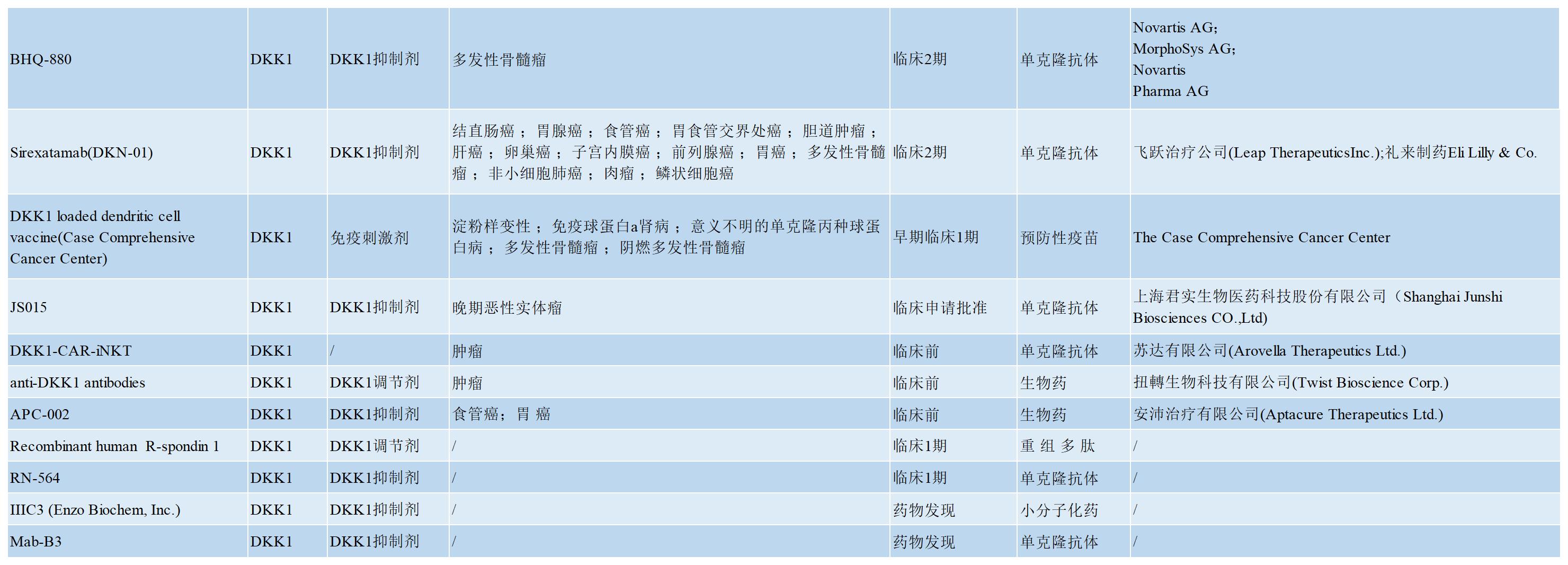 DKK1具有調節免疫的特性,它對免疫系統的抑制作用使其成為免疫治療的一個有前景的靶點。此前,Leap Therapeutics開發了抗DKK1中和抗體DKN-01并在晚期胃食管交界處和胃癌癥(GEJ/GC)以及婦科癌癥的I期或II期試驗中進行了評估,其方案包括與紫杉醇或pembrolizumab的單藥治療和聯合治療比較,值得注意的是,患有Wnt信號突變的婦科癌癥患者可以從DKN-01治療中獲益。GEJ/GC的另一項正在進行的臨床研究也表明,在腫瘤表達高水平DKK1(DKK1高)的患者中生存率和客觀反應結果都有所提高;非常令人鼓舞的結果表明,DKN-01加Keytruda治療可使中位無進展生存期(PFS)超過22周,中位總生存期(OS)接近32周,在既往未接受抗PD-1/PD-L1治療的DKK1高GEJ/GC患者中,ORR為50%,疾病控制率(DCR)為80%;在對PD-1/PD-L1治療難治的6名GEJ/GC患者中,3名血清DKK1水平高的患者病情穩定,而3名血清DKK1水平低的患者病情則發生進展。這些結果表明,DKK1抑制治療顯著改善了血清DKK1水平高的患者的療效,并由此得出在DKK1高表達腫瘤患者中使用DKK1抑制劑和PD1/PDL-1免疫檢查點聯合治療的方案是一種獲得更好療效的策略。目前已有多個DKK1抑制劑處于研發階段,其中多數為DKK1的中和抗體,也有少量的小分子及重組多肽,小核酸藥物等( 如下表所示)。
