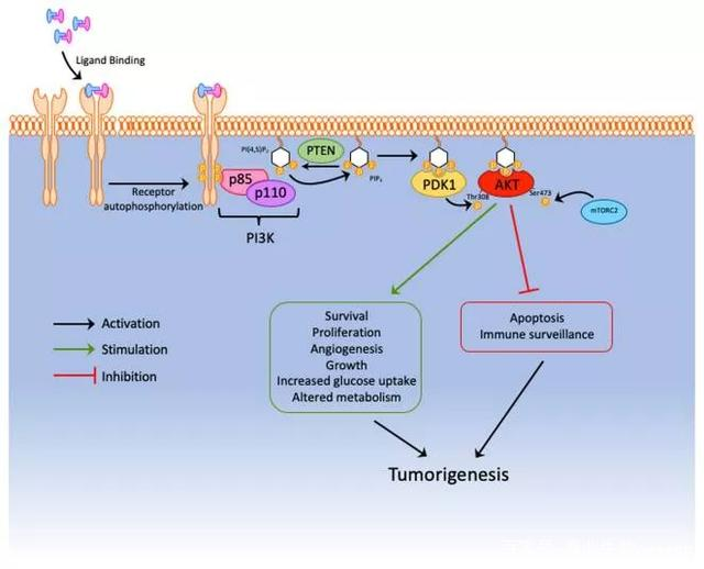圖1. PTEN抑制PI3K途徑和AKT的下游致癌信號。通過使PIP3磷酸化,PTEN阻止了PDK1激活AKT,從而防止了腫瘤的發生。