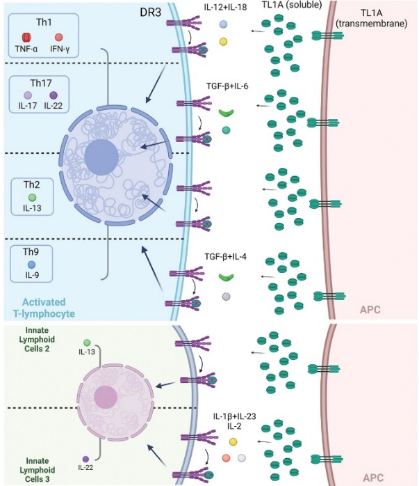 TL1A/DR3信號的下游作用包括產生幾種關鍵的因子,如IFN-γ、TNF-α、IL-6和IL-17,以及IL-2、IL-4、IL-13,這些促炎因子表達上調,并可能產生致病作用。