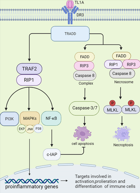 在靜息的T細胞中,DR3以可溶性形式表達,保護細胞免于凋亡。活化的T細胞表達跨膜DR3。sTL1A結合DR3 (膜結合形式)激活下游信號級聯,從而調節免疫反應和炎癥。sTL1A/DR3相互作用可觸發兩種不同的信號通路,分別引起炎癥和細胞凋亡。首先,DR3的死亡結構域與細胞質中的適配蛋白TNFR相關死亡結構域蛋白(TRADD)結合,然后招募TNFR相關因子2 (TRAF2)和受體相互作用蛋白1 (RIP1)。這些復合物激活MAPKs (ERK、p38和JNK)、NF-κB和效應激酶PI3K信號傳導。最后,激活的信號傳導調節促炎基因的表達,參與免疫相關疾病的發生。TRADD結合FAS相關死亡結構域(FADD)和RIP3,激活半胱氨酸天冬氨酸特異性蛋白酶-8 (caspase-8)形成復合物,進一步激活下游caspase通路(如caspase-3和-7),誘導凋亡細胞死亡。當caspase-8活性被阻斷時,FADD、RIP3、RIP1與下游效應分子混合譜系激酶結構域樣蛋白(mixed lineage kinase domain-like protein, MLKL)在磷酸化后形成胞質“壞死體”復合體。然后,MLKL寡聚到細胞膜上,導致壞死性細胞死亡,這是一種伴有強烈炎癥的細胞死亡形式。在這個過程中,NF-κB被證明可以誘導細胞凋亡抑制蛋白(c-IAP)的激活,從而介導細胞凋亡的負反饋調節和抑制。事實上,更多的證據表明,sTL1A與DR3的連接優先誘導淋巴細胞的促炎途徑而不是凋亡。