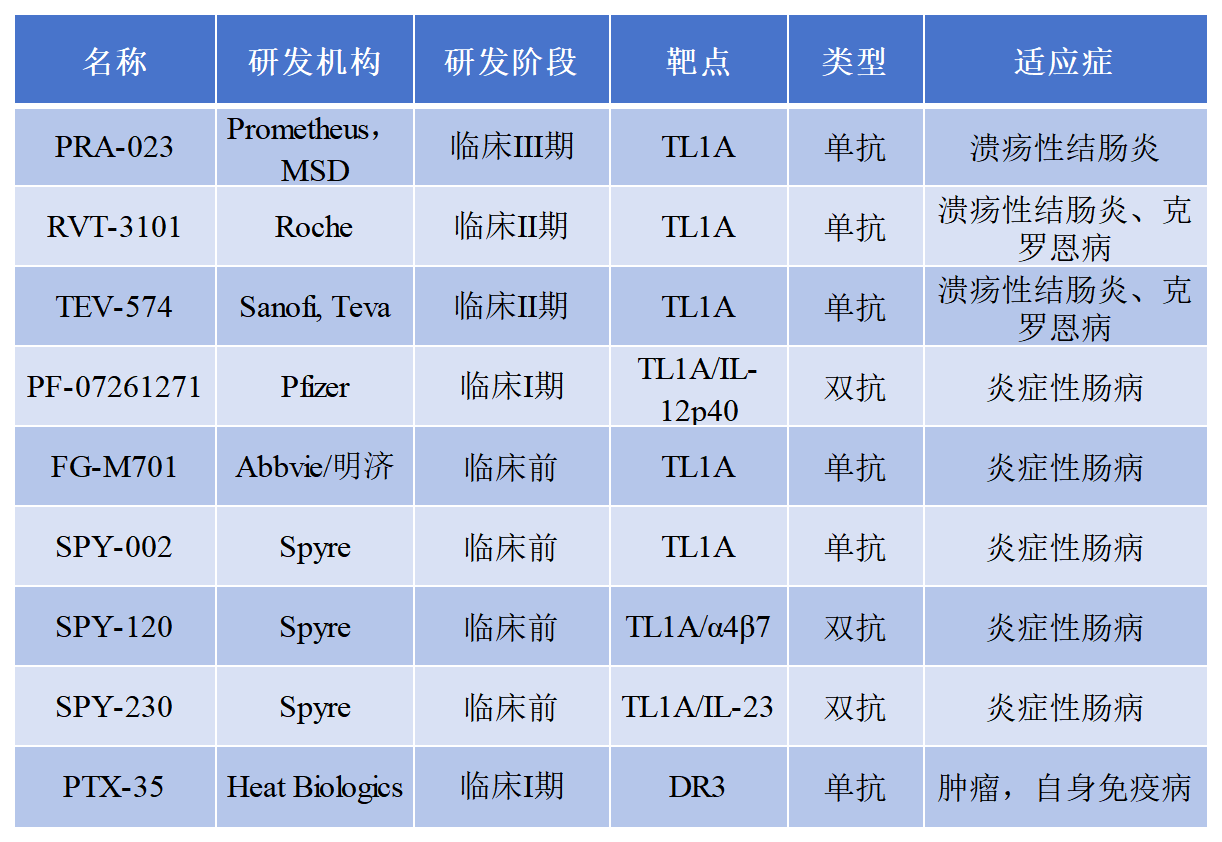 2023年10月23日,羅氏宣布收購Telavant,獲得其在研核心產品TL1A抗體RVT-3101,因此越來越多的藥企布局TL1A/DR3藥物的研發。目前關于TL1A靶點,在研藥物有單抗也有雙抗,主要針對克羅恩病、潰瘍性結腸炎等IBD疾病。關于DR3靶點,目前就只有PTX-35在研。