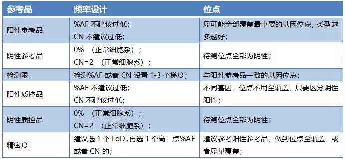 2.陽性參考品設置最為復雜,著重聚焦臨床意義的基因位點,不要求全覆蓋,同時要考慮靈敏度(最低檢出限LoD)設置,考慮到濃度梯度或突變梯度的不同,應對各水平陽性參考品設置相應檢出要求;