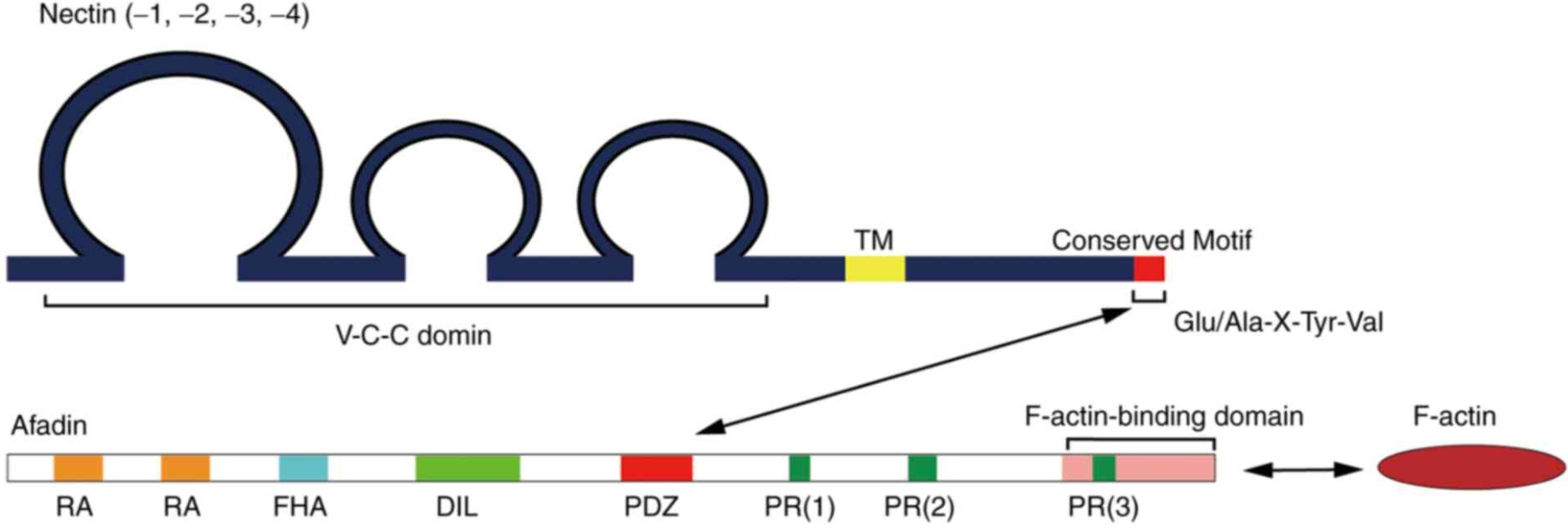 胞質尾的C端都包含一個afadin (一種 F-肌動蛋白結合蛋白)結合基序,與Nectin-4不同的是,Nectin-1、Nectin-2、Nectin-3的afadin結合基序都是保守序列 Glu/Ala-X-Tyr-Val,可與 afadin的PDZ 結構域結合;而Nectin-4可通過其C末端的 Gly-His-Leu-Val 基序與銜接分子afadin結合。當Nectins與銜接分子afadin結合后,afadin會結合并募集絲狀肌動蛋白組件 (F-actin),從而促進細胞與細胞之間的粘附。Nectin家族與鈣黏著蛋白共同作用,對粘著連接和緊密連接的產生和維持具有顯著影響,它們調節多種細胞行為,包括細胞粘附、生長、分化、遷移和凋亡。