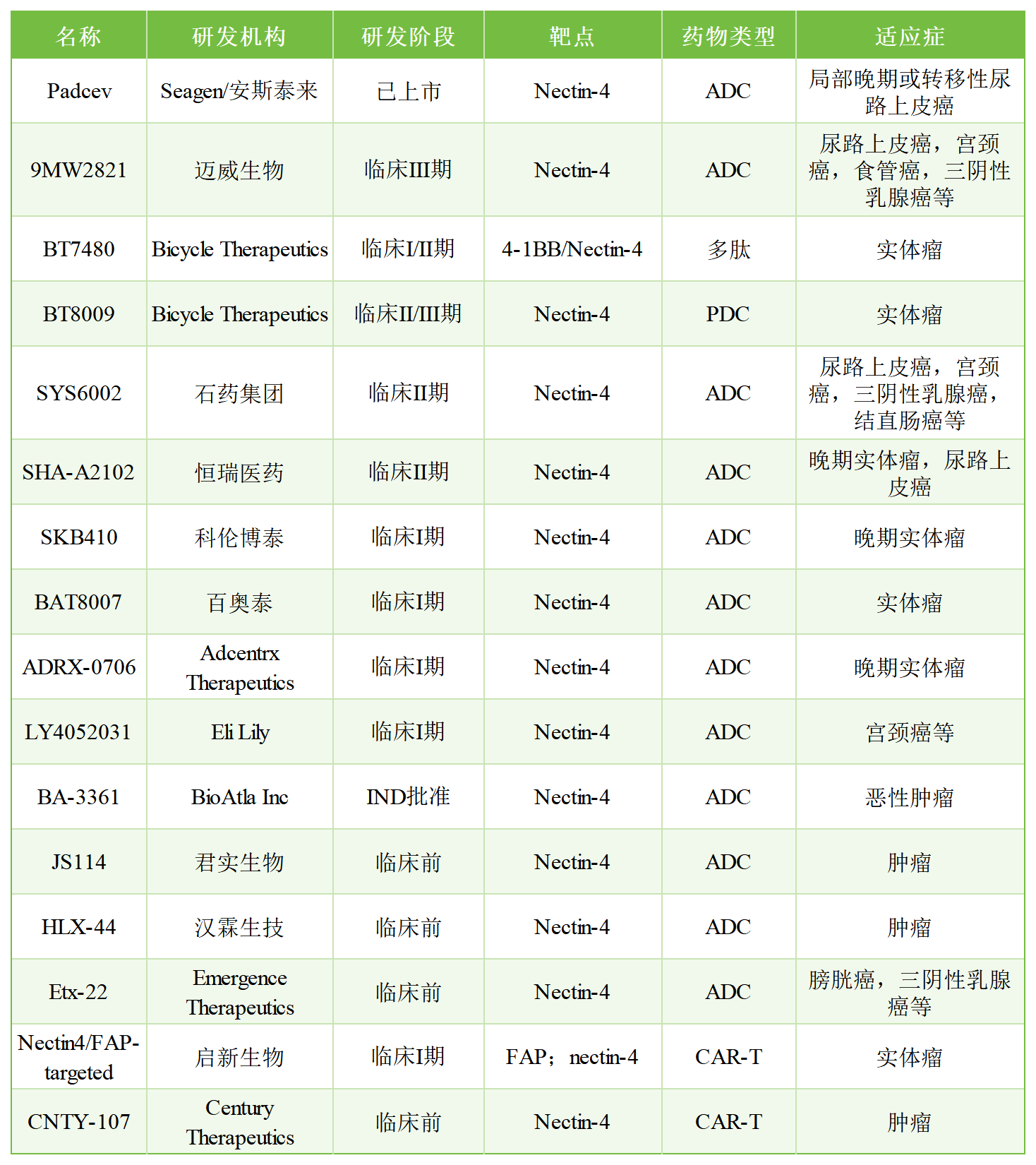 全球第一款已上市的Nectin-4 ADC產品Padcev在2023年銷售收入超10億美金,使得Nectin-4也成為了ADC的新興靶點,越來越多的藥企紛紛布局Nectin-4靶點。目前,Nectin-4靶點的藥物以抗體-藥物偶聯物(ADC,又叫抗體偶聯藥物)為主。