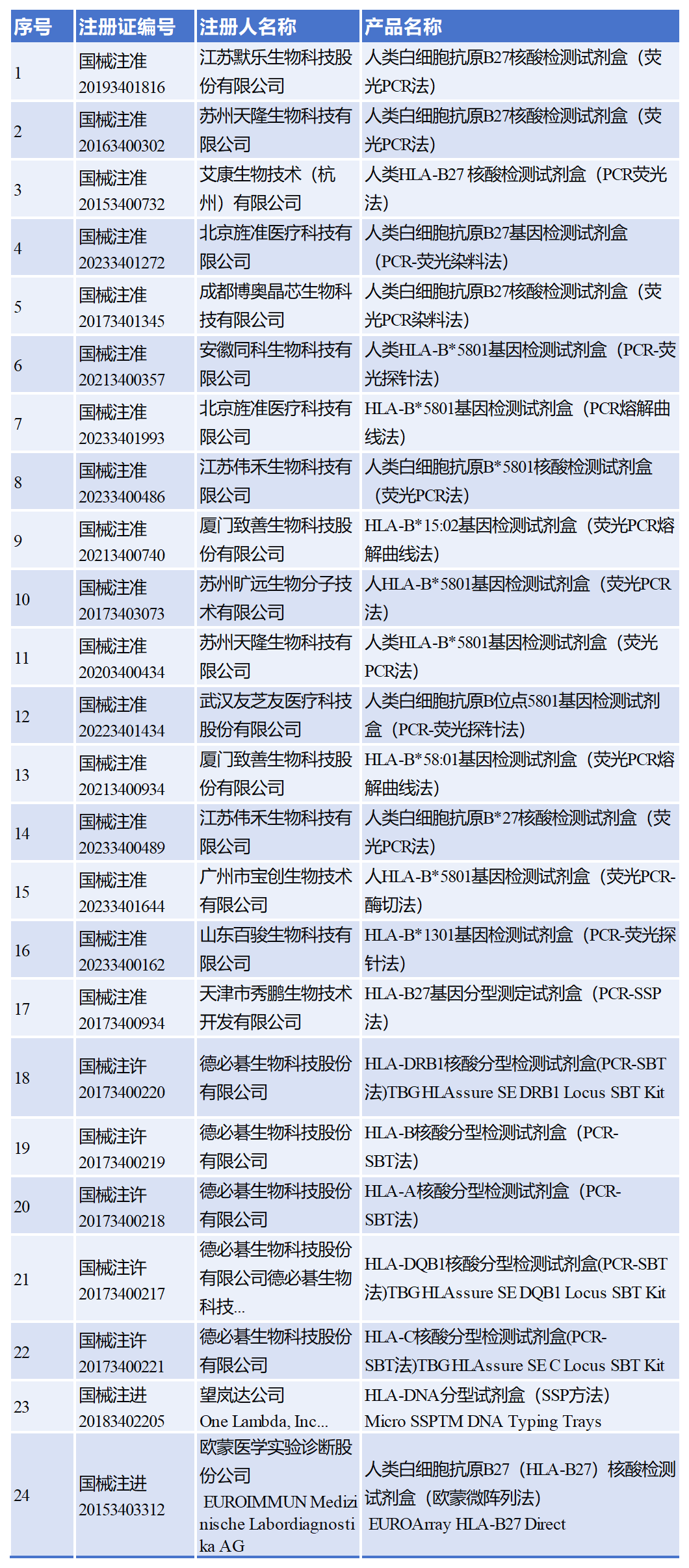 截至目前,已有24款HLA核酸檢測相關試劑盒獲批,具體如下: