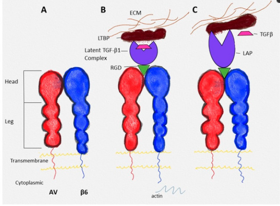 整合素αvβ6特異的配體主要配體包括細胞外基質蛋白如纖維連接蛋白(Fibronectin)、層粘連蛋白(Laminin)以及潛活形式的TGF-β。潛伏期相關肽(LAP)是轉化生長因子β(TGF-β)前體肽的氨基末端結構域,形成潛在的 TGF-β 復合物,并充當整合素 αvβ6 的配體。當整合素 αvβ6 通過LAP與細胞外位點的潛在TGF-β復合物結合時,同時與細胞內細胞骨架結合時,活性TGF-β從潛在復合物中釋放出來,驅動纖維化和免疫抑制微環境形成;此外,αvβ6還可作為口蹄疫病毒(FMDV)等病原體的入侵受體。